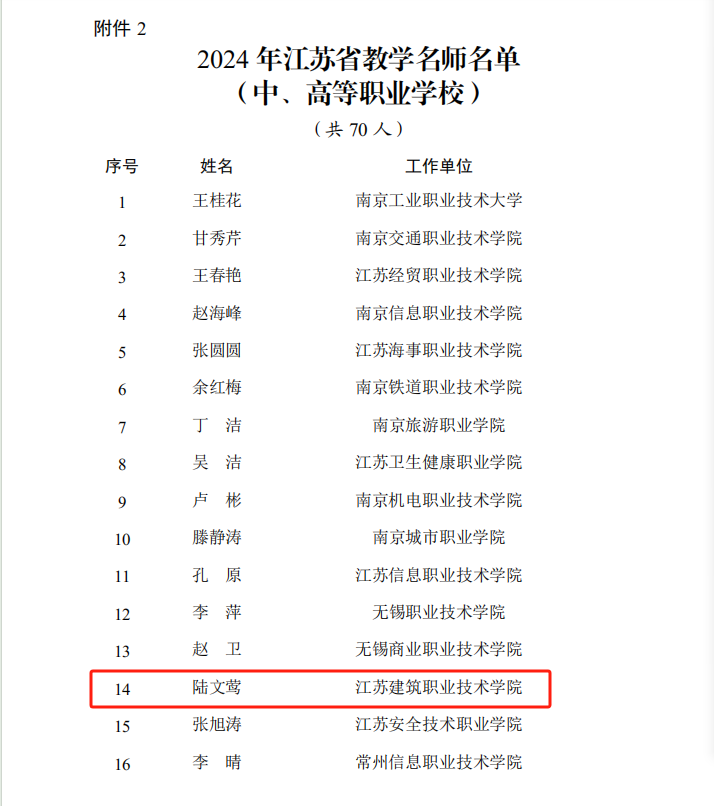 近日,江苏省教育厅公布2024年江苏省教学名师人选名单,我校建筑装饰学院教师陆文莺入选,这也是《江苏省教学名师支持计划》(苏教师〔2022〕5号)实施以来,我校教师连续三年入选。