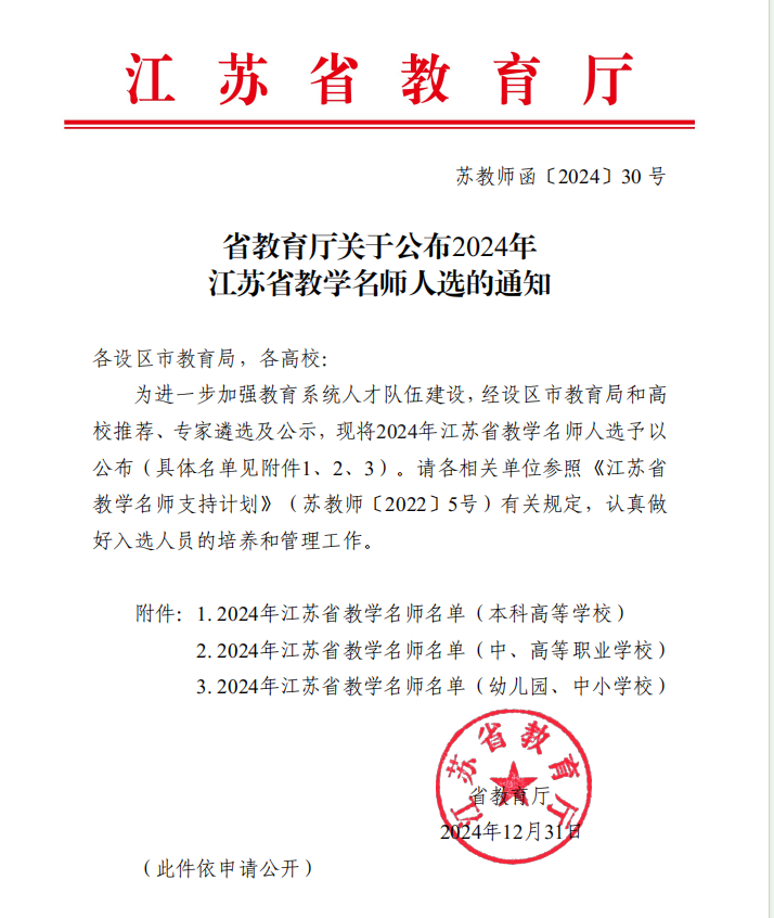 江苏省教学名师是省教育厅为全面贯彻习近平总书记关于教育的重要论述和中央人才工作会议精神,加快建设高素质专业化创新型教师队伍所制定的高层次教育人才支持计划。