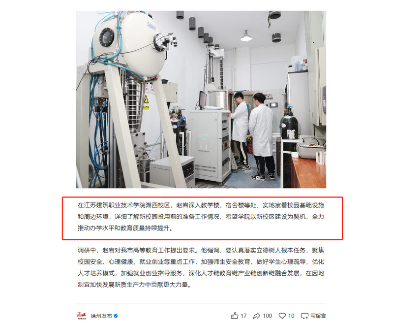 3月20日,副省长赵岩来徐调研高等教育工作。市委书记宋乐伟,省政府副秘书长邱志强,副市长刘景陪同调研。