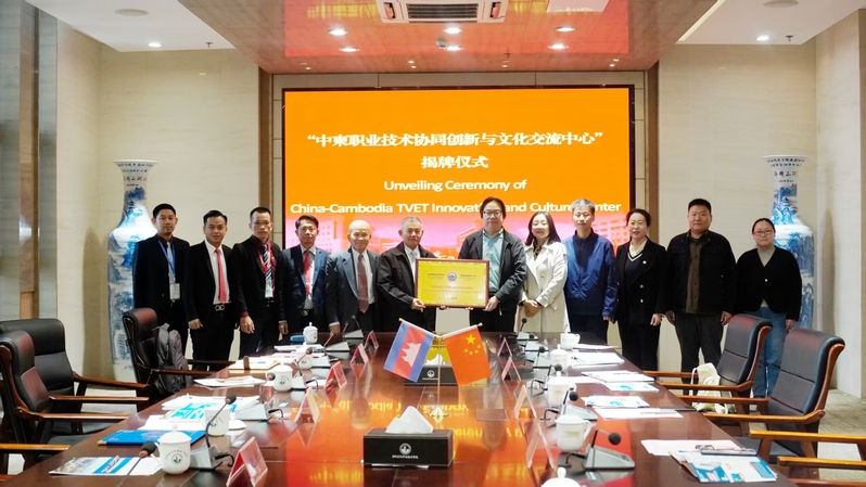 随后,刘海波和费科迪代表两校共同揭牌“中柬职业技术协同创新与文化交流中心”。