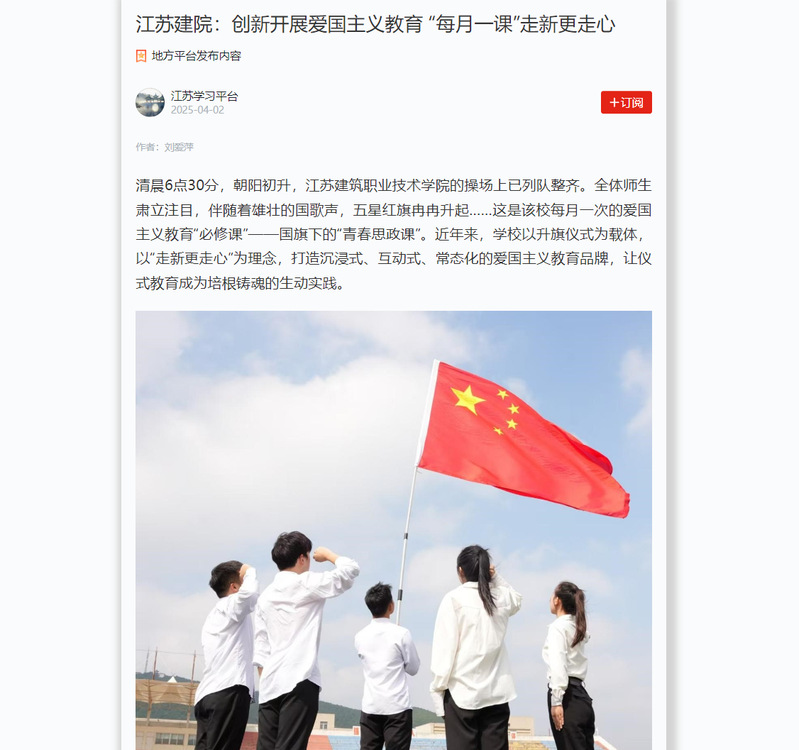 学校注重将仪式教育与成长需求深度融合。围绕五四、七一、国庆等重要节点,设计“青春告白祖国”“我与国旗合个影”等主题活动;结合地域红色文化,组织学生走进革命纪念馆、烈士陵园开展“行走的升旗仪式”。2023级学生任涛感慨:“当听到校友前辈登上央视舞台讲述他亲身参与徐工的国际化进程,助力徐州制造走向世界的故事时,我突然明白爱国不仅是口号,更是学好技能的实际行动。”