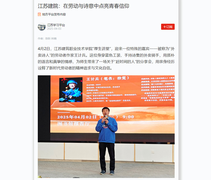 王计兵的诗歌《赶时间的人》等也将被纳入思政课和课程思政案例教学资源库,作为分析劳动者精神与时代风貌的素材。老师和同学们纷纷表示,“这才是青春该追的星”“劳动精神与人文情怀的双向奔赴”。当外卖箱与书本相遇,当汗水与墨水交融,劳动者诗人用亲身经历证明:最美的青春,永远绽放在脚踏实地的大地上。