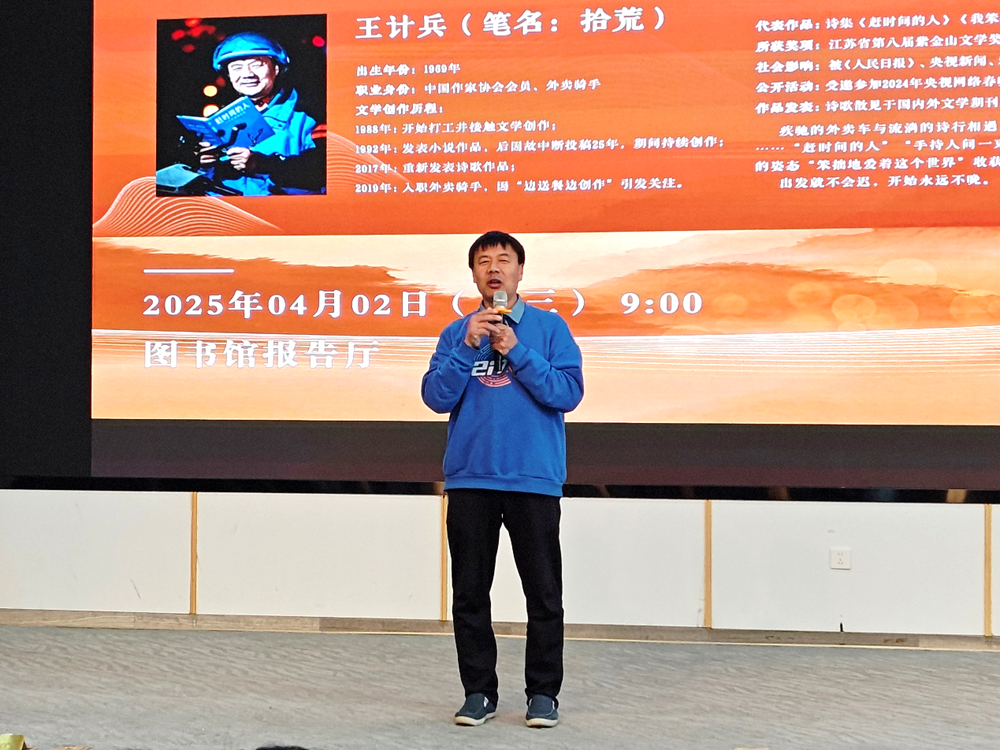 4月2日,开云在线平台“厚生讲堂”,迎来一位特殊的嘉宾——被称为“外卖诗人”的劳动者作家王计兵。这位身穿蓝色工装、手持诗集的外卖骑手,用质朴的语言和真挚的情感,为师生带来了一场关于“赶时间的人”的分享会,用亲身经历诠释了新时代劳动者的精神追求与文化自信。