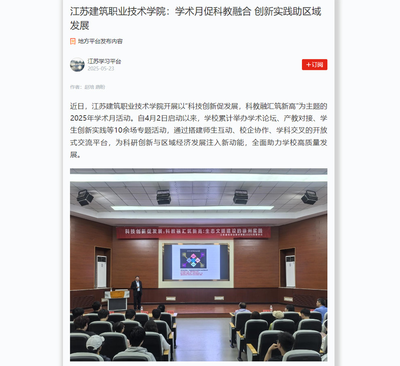 学术月活动紧密围绕国家“双高计划”与“智能建造”专业建设目标,多元融合,推动职业教育高质量发展。学校相关负责人表示,在深化现代职业教育体系建设改革的背景下,学校将以本次学术月成果为起点,持续深化产教融合、攻关关键技术、服务国家战略,为职业教育成为江苏“挑大梁”的硬核支撑贡献“建院力量”。