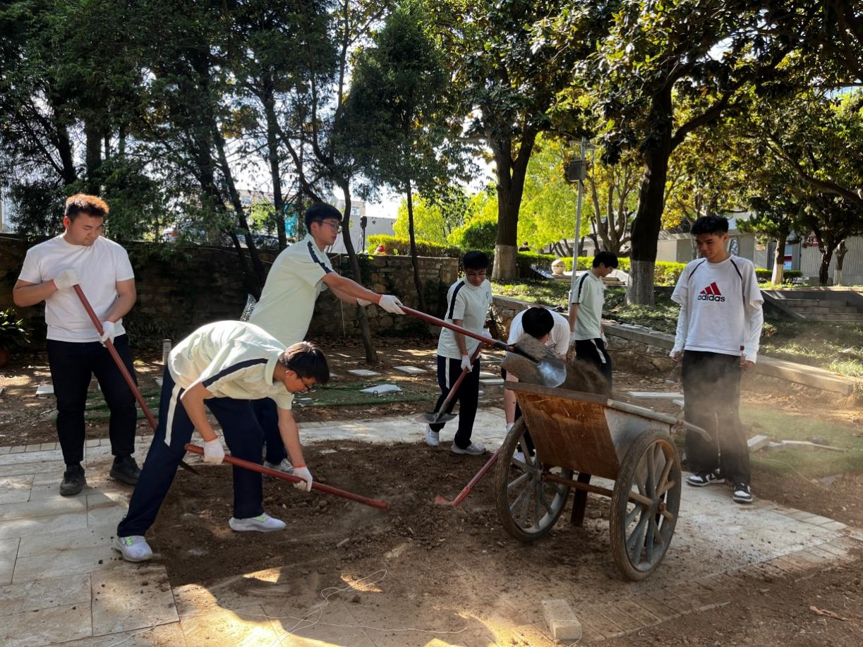 劳动教育月期间,150余人次学子投身徐州云龙湖景区志愿服务,创新开发“文化导览”“非遗解说”等特色服务岗。在“共植青绿”生态行动中,师生共同,通过选址测量、开挖种植穴、栽种、回填、浇水养护,为校园增添绿色,增强学生对劳动的热爱与认知。