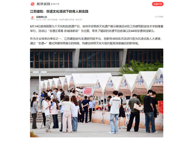 作为主会场承办单位之一,江苏建院依托非遗研究院平台,创新性地将此次活动打造为沉浸式育人大课堂,通过“非遗+”模式突破传统展示的局限,构建出传统文化与现代教育深度融合的新场域。