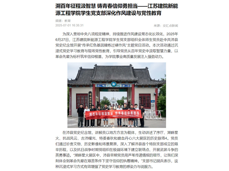 党支部将持续深化“党建+专业”融合模式,依托沛县党史纪念馆等红色资源建立常态化学习机制,引导党员把作风建设成果转化为服务新能源产业发展的实际行动,以“功成不必在我”的精神境界和“功成必定有我”的历史担当,为实现中国式现代化贡献青春力量。