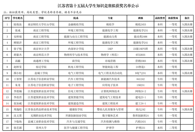 近日,“江苏省第十五届大学生知识竞赛”获奖名单公布,我校学生取得一等奖3项、二等奖23项,三等奖118项、优秀奖194项的好成绩,其中信电工程学院网络 24-2 班学生李震楠以优异表现入围决赛,我校成为全省仅 2 所入围决赛的高职院校之一。
