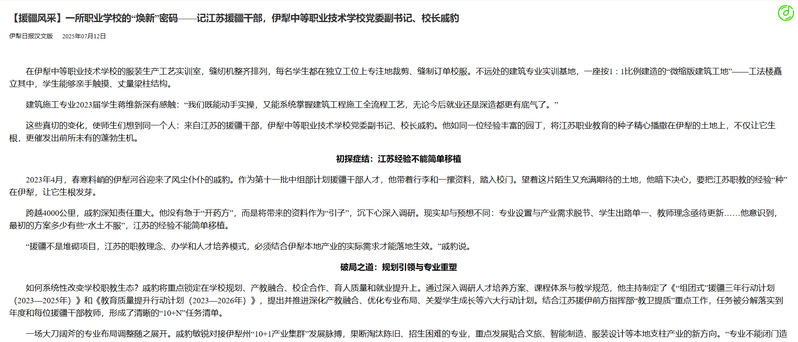 “援疆不是堆砌项目,江苏的职教理念、办学和人才培养模式,必须结合伊犁本地产业的实际需求才能落地生效。”戚豹说。