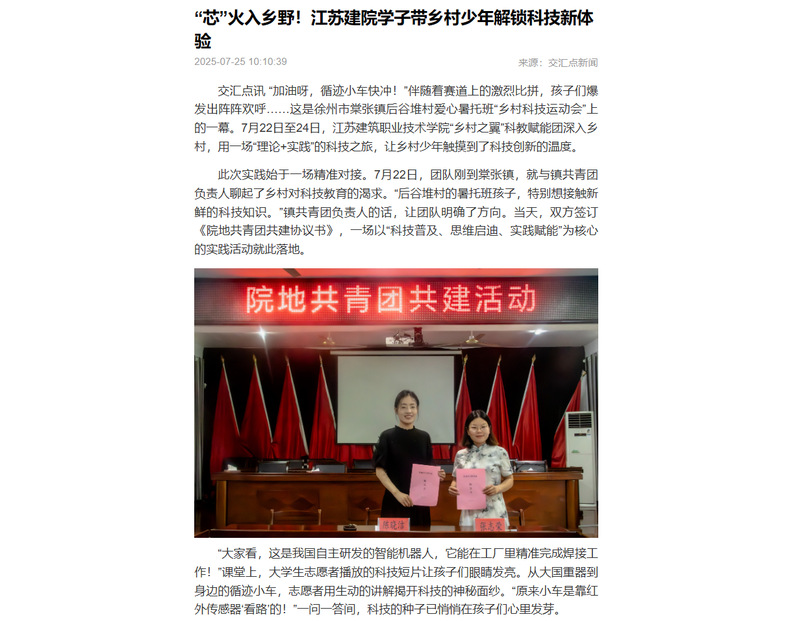 三天的实践虽短,却在孩子们心里种下了科技的种子。江苏建院“乡村之翼”科教赋能团的这次尝试,正是科技赋能乡村教育的生动实践。江苏建院智能制造学院将以此次院地共建为支点,持续深化“乡村之翼”品牌,让科技教育的星火在广袤乡村燎原,为培育未来科创栋梁、赋能乡村全面振兴注入强劲的“智造”动能。