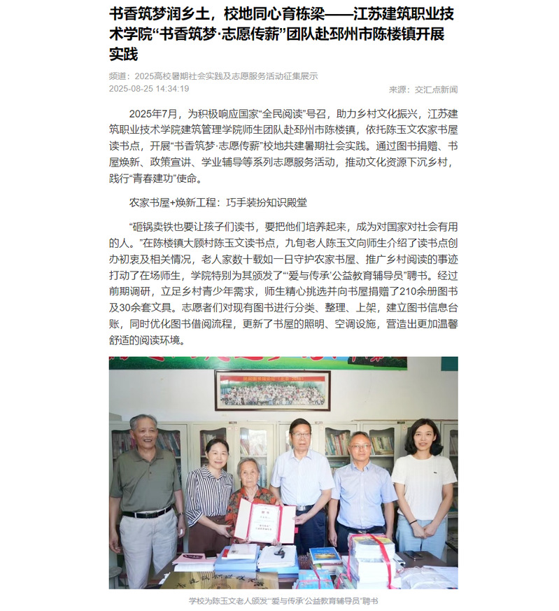 2025年7月,为积极响应国家“全民阅读”号召,助力乡村文化振兴,开云在线平台建筑管理学院师生团队赴邳州市陈楼镇,依托陈玉文农家书屋读书点,开展“书香筑梦·志愿传薪”校地共建暑期社会实践。通过图书捐赠、书屋焕新、政策宣讲、学业辅导等系列志愿服务活动,推动文化资源下沉乡村,践行“青春建功”使命。