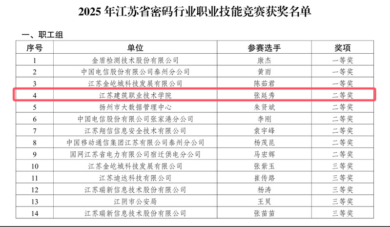 近日,由江苏省国家密码管理局、省总工会、省委省级机关工委、省委网信办、省教育厅共同举办的2025年江苏省密码行业职业技能竞赛在常州落幕。我校信电工程学院教师张廷秀在职工组比赛中表现优异,位列第四名,荣获二等奖;该院学生於学洋、万宸羽、张天冰组成的参赛队伍荣获学生组第九名,获评优胜奖。