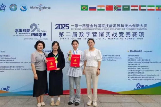 11月9日,由金砖国家工商理事会中方理事会、一带一路暨金砖国家技能发展国际联盟等单位主办,东莞职业技术学院承办的2025一带一路暨金砖国家技能发展与技术创新大赛之第二届数字营销实战竞赛全国总决赛在广东东莞举行。由我校2024级数字商务卓越工匠班学生王可欣、肖艺如组成的参赛团队(指导教师:张娴、杜春梅),在比赛中获全国金奖。