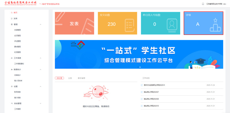 本次等级评定涵盖了党建引领、队伍入驻、学生参与、文化建设、数字赋能、条件保障等六大维度,全面检验高校“一站式”学生社区的建设质量与育人实效。据悉,按照教育部思政司评定标准,A级高校占比不超过参评总数的15%,本次全省仅有7所高职院校获该等级。