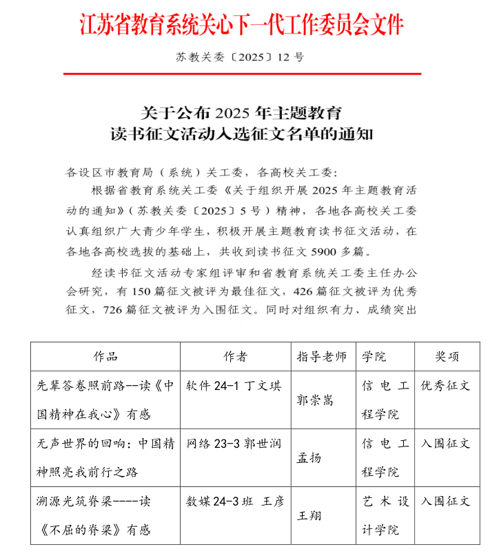 近日,江苏省教育系统关工委公布2025年主题教育读书征文活动获奖名单,我校推荐的3篇征文,1篇获优秀征文、2篇获入围征文。