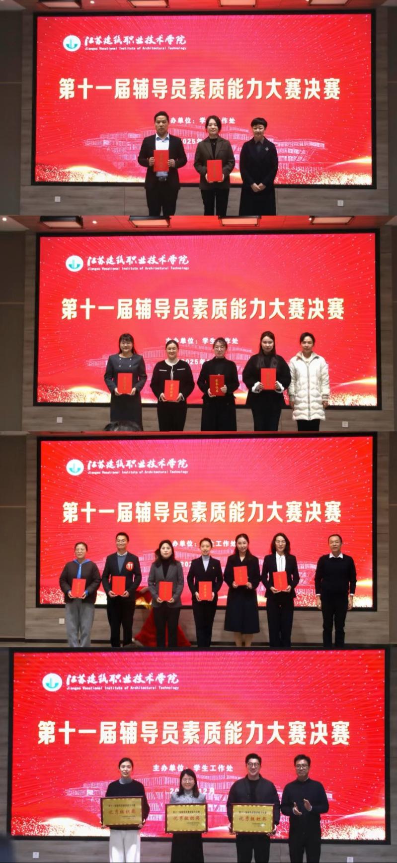 为全面落实立德树人根本任务,进一步提升我校辅导员队伍的专业素养和育人能力,12月19日,我校在路演大厅举行辅导员素质能力大赛决赛,比赛邀请中国矿业大学学工处处长闵涛、江苏师范大学学工处处长杜昀、江苏安全技术职业学院学工处处长赵琦担任评委。学校党委副书记梁惠、相关部门负责人、各学院党总支副书记及辅导员进行现场观摩。